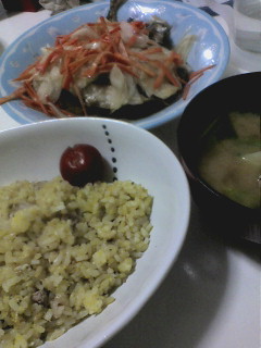 で、晩飯にはチャーハンと味噌汁(じゃがいもとほうれん草で)、とアジの南蛮漬け。